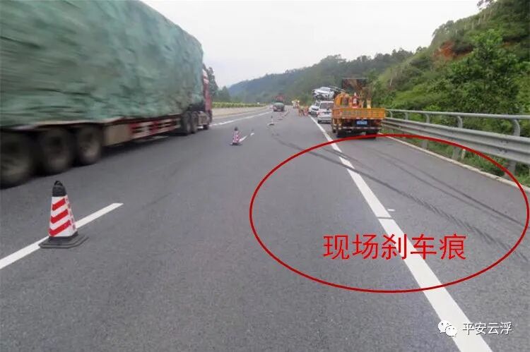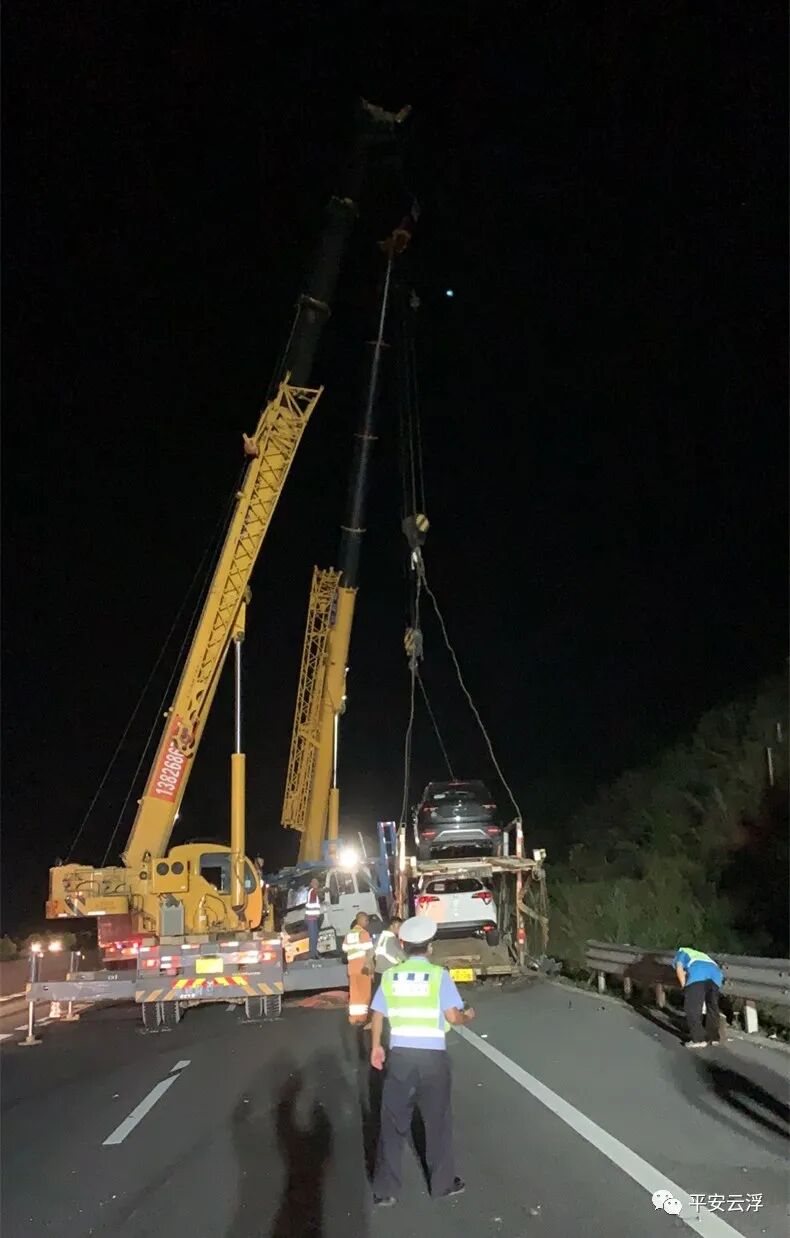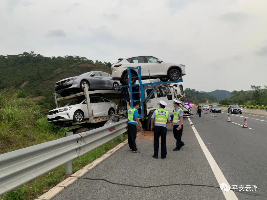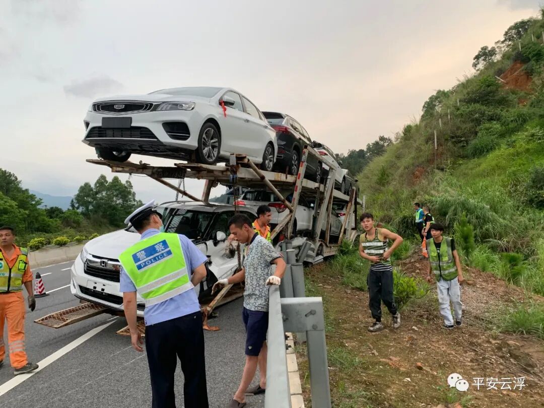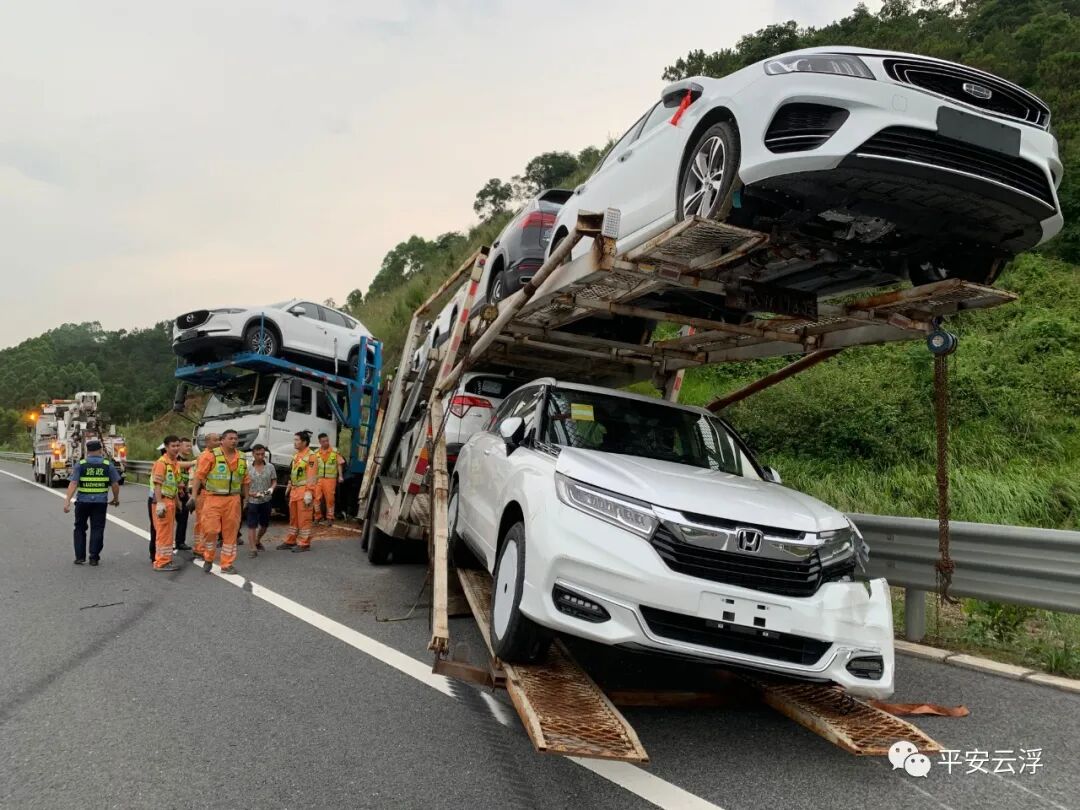 经核验,该车总共装载9台商品车,超载3台,其中鄂C9G6**牵引车驾驶室车顶加载1台,冀AW8**挂车车厢尾部加载了2台商品车,比正常装载长了5米多,车辆刹车痕迹100多米。 现场交警分析造成事故主要原因是车辆行驶速度过快,进入弯道急刹,因车辆超长超限,造成甩尾漂移,冀AW8**挂车车辆车尾右侧第一次碰擦护栏,然后失控继续往前行驶200多米后再发生二次碰撞右侧护栏,车辆才停下来。 事故发生后,云浮市公安局交警支队高速四大队、辖区路政、养护等部门迅速赶赴事故现场,齐心协力展开道路管控、护送司机到医院检查、事故车辆拖移等紧急救援工作,并及时调动两台大功率吊车投入救援工作。经过40多人连续5个小时的合力救援,成功用吊车将事故中多台车辆分离并拖离现场,恢复道路交通有序通行。 事故造成牵引车、挂车严重受损,车上9台商品车不同程度损坏,虽然未造成人员伤亡,但经济损失惨重,且该车超长超限,存在极大安全隐患。司机李某因驾驶超长超限车辆上路行驶,承担事故的全部责任。