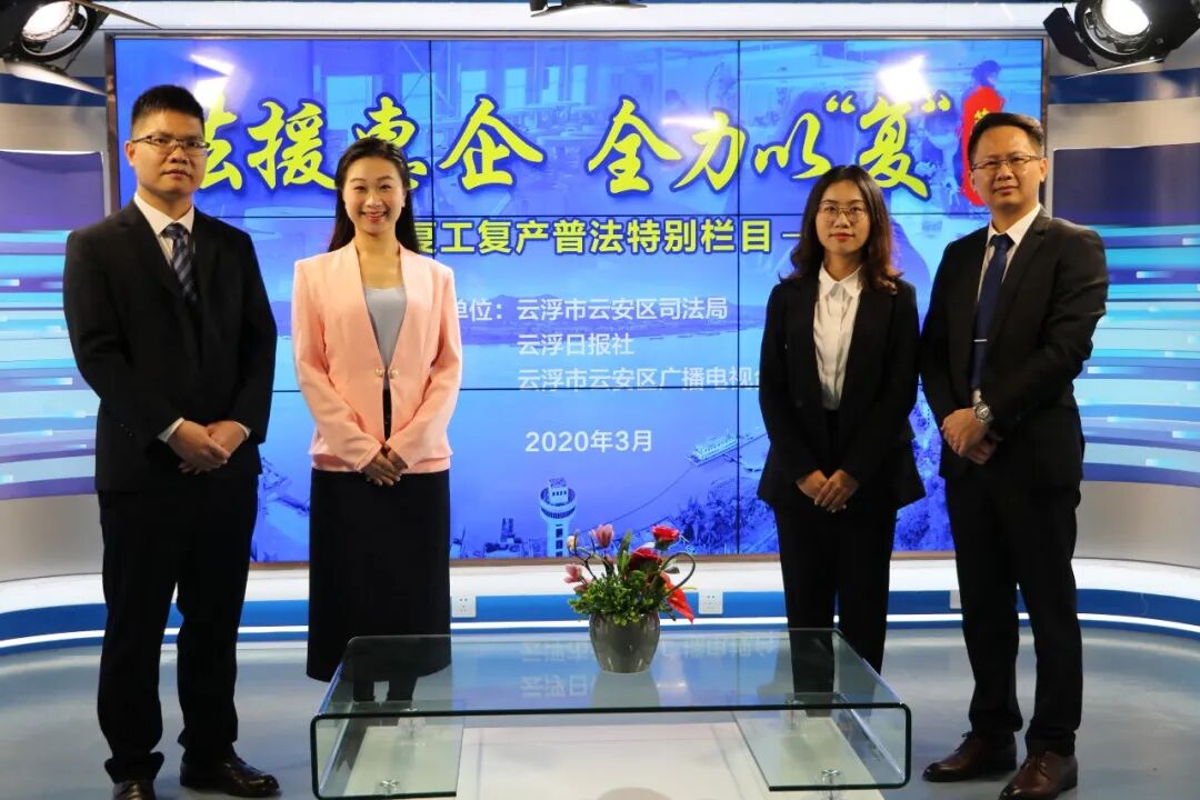 2020年3月6日,在新冠肺炎疫情防控处在最吃劲的关键阶段,云安区司法局联合云浮日报社、云安区广播电视台开办《法援惠企 全力以“复”》普法栏目,全面落实中央、省、市、区关于疫情防控的决策部署,支持帮助企业共渡难关,全力保障企业依法有序复工复产。