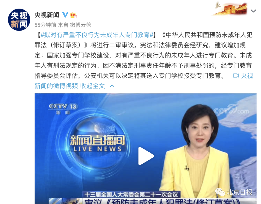 据央视新闻报道,十三届全国人大常委会第二十一次会议听取全国人大宪法和法律委员会关于《中华人民共和国预防未成年人犯罪法(修订草案)》修改情况的汇报,在全国人大常委会第十四次会议对这部法律进行初次审议基础上,将对这部法律进行二审审议。