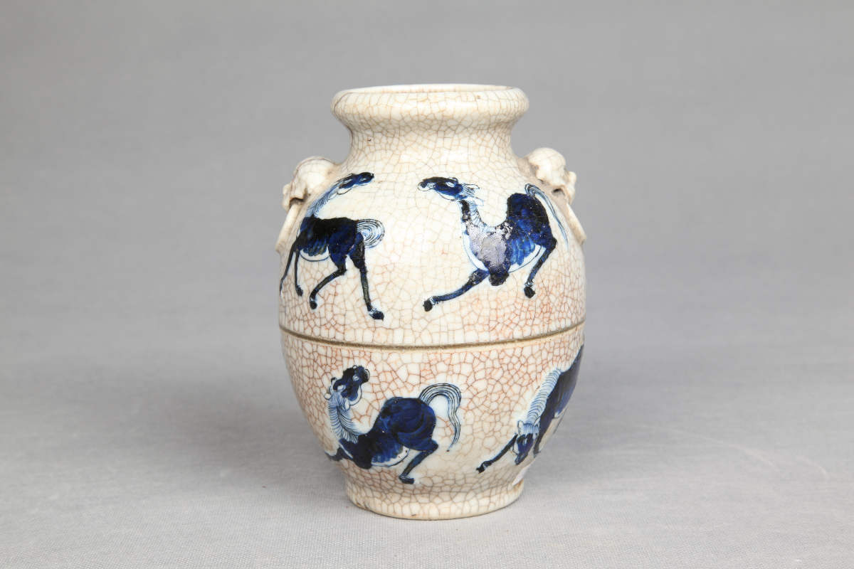 此罐高16.92厘米,口径7.13厘米,底径7.15厘米,腹径达12.68厘米,整体造型浑厚敦实,展现出明代晚期青花瓷器的典型风貌。罐体设计巧妙,两侧是狗头衔着圆把手模样的端耳。罐身中部以一条清晰的接痕为界,将其分为上下两部分,既增强了结构的稳定性,又赋予了其独特的美学意义。、