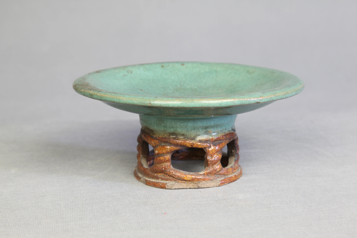 石湾窑陶瓷制作技艺,作为非物质文化遗产,承载着中华民族深厚的文化底蕴和民族记忆。一代又一代的匠人们,用他们的智慧和汗水,将这门技艺传承下来,使之得以在今日依然熠熠生辉。明清时期,石湾陶塑瓦脊因其天然的防腐、隔热、防污等特性而被广泛用于各种建筑装饰中。此绿釉高足瓷碟,便是这份传承的见证。它让我们看到了匠人们对技艺的执着追求和对传统的尊重与传承。