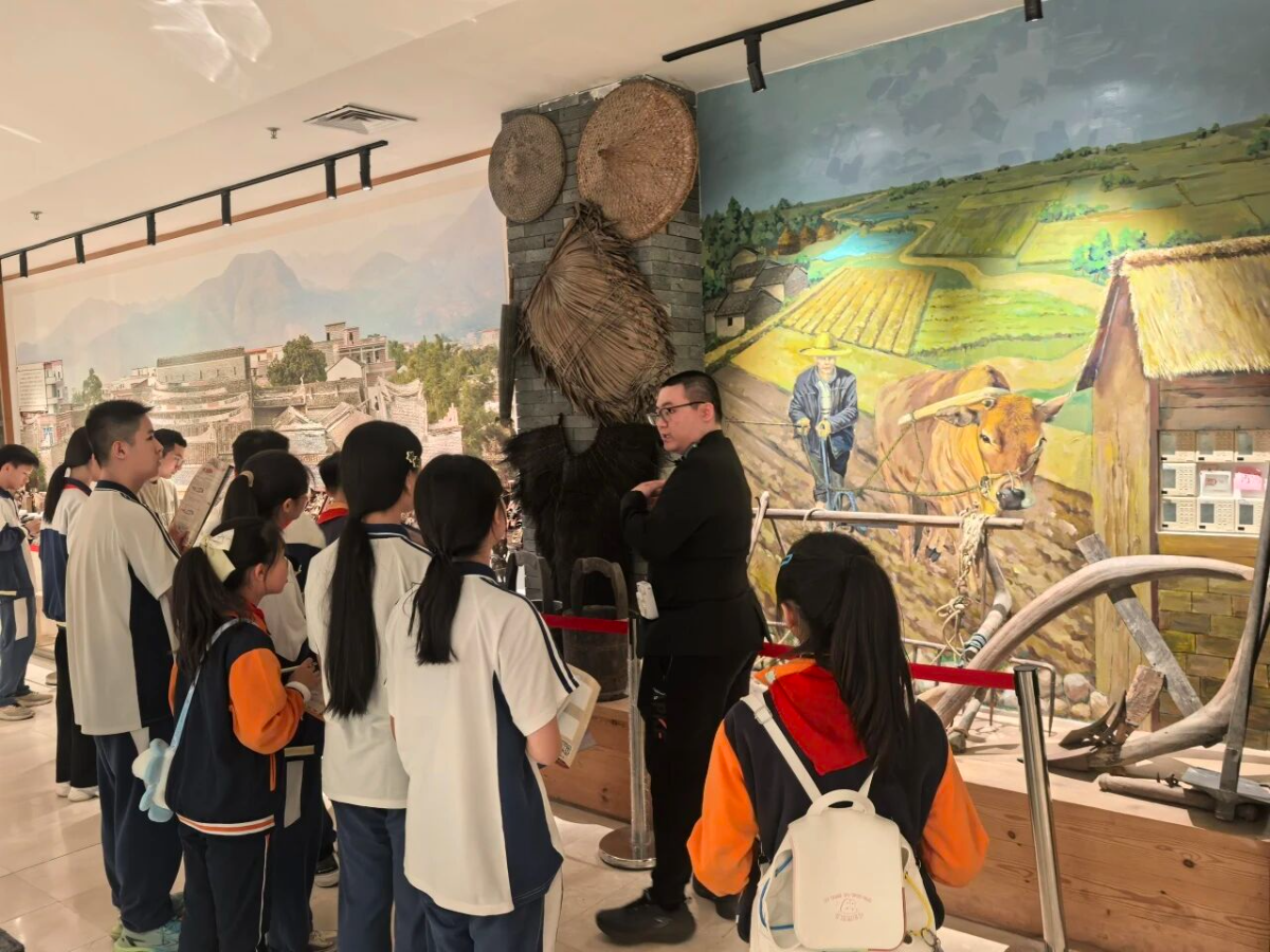 在博物馆中,讲解员结合石器时代、封建时代、现代等各类农耕器具文物,深刻展示了农耕文化是如何贯穿中华文明的发展历程,让学生了解到农耕对于中华文化发展的起源性和重要性。同时穿插农历节日“龙抬头”的讲解,链接农耕文化与龙文化,拓展了学生们对于龙文化与农耕文化之间的了解。