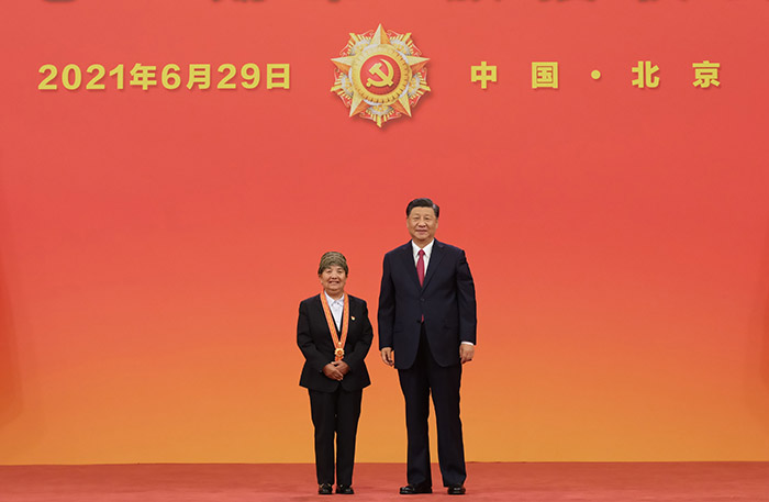 6月29日,庆祝中国共产党成立100周年“七一勋章”颁授仪式在北京人民大会堂金色大厅隆重举行。中共中央总书记、国家主席、中央军委主席习近平向“七一勋章”获得者卓嘎颁授勋章。新华社记者 李学仁 摄