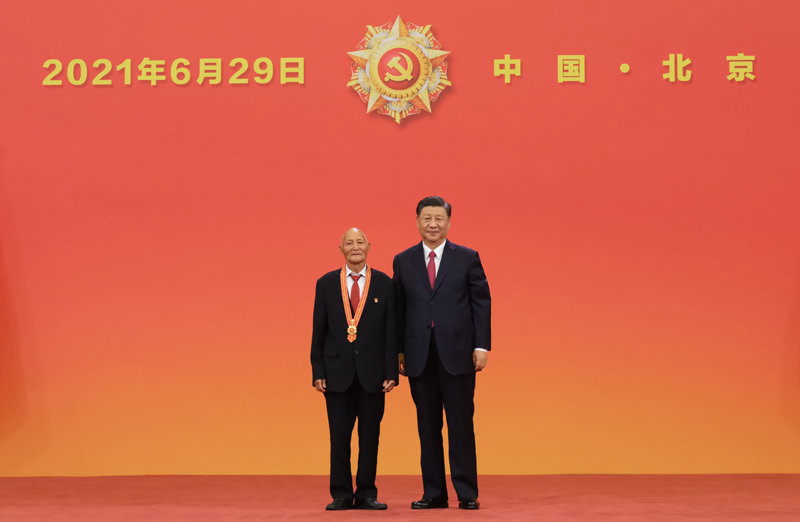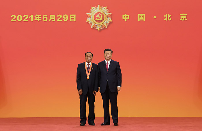 6月29日,庆祝中国共产党成立100周年“七一勋章”颁授仪式在北京人民大会堂金色大厅隆重举行。中共中央总书记、国家主席、中央军委主席习近平向“七一勋章”获得者黄大发颁授勋章。新华社记者 李学仁 摄