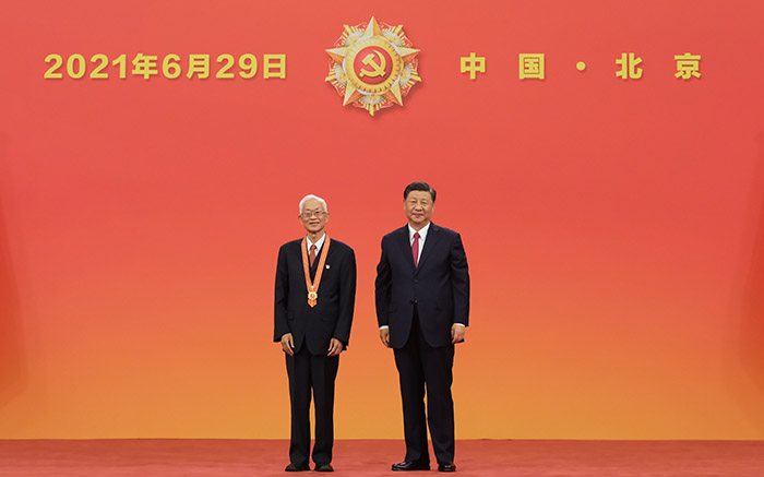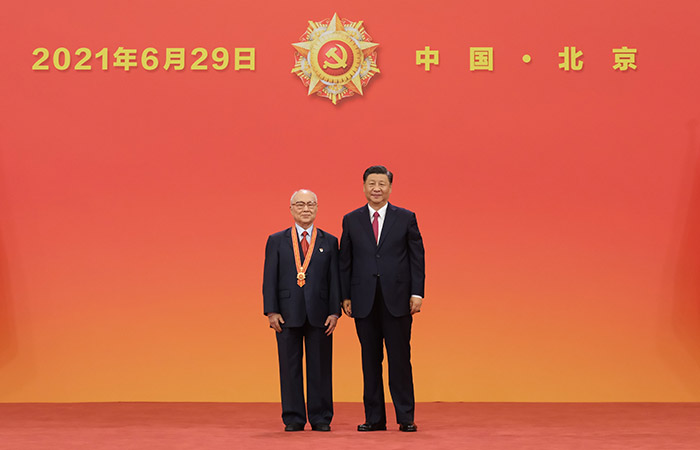 6月29日,庆祝中国共产党成立100周年“七一勋章”颁授仪式在北京人民大会堂金色大厅隆重举行。中共中央总书记、国家主席、中央军委主席习近平向“七一勋章”获得者周永开颁授勋章。新华社记者 李学仁 摄