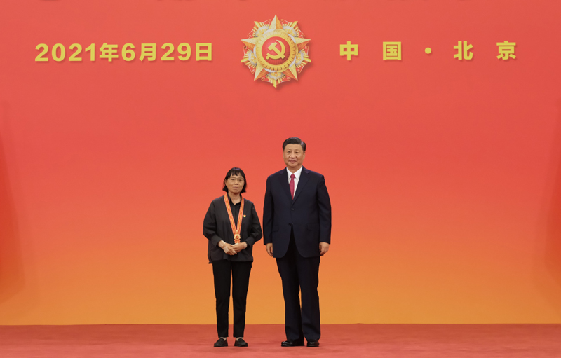 6月29日,庆祝中国共产党成立100周年“七一勋章”颁授仪式在北京人民大会堂金色大厅隆重举行。中共中央总书记、国家主席、中央军委主席习近平向“七一勋章”获得者张桂梅颁授勋章。新华社记者 李学仁 摄
