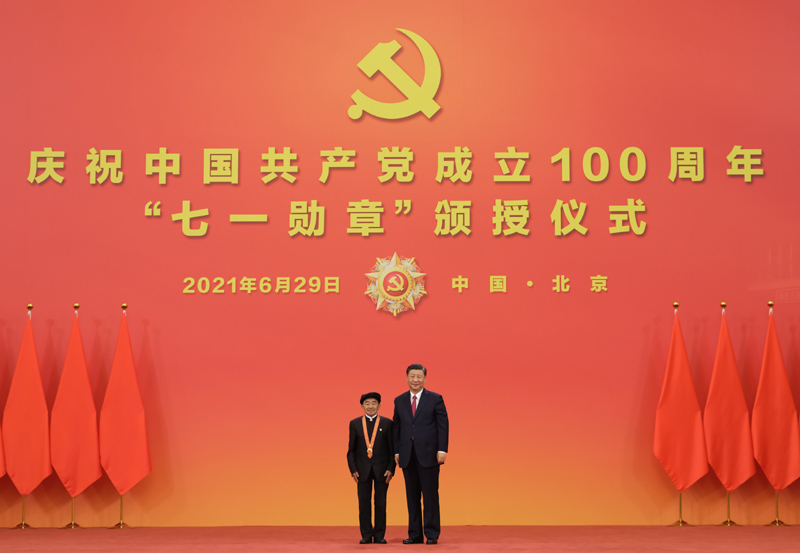6月29日,庆祝中国共产党成立100周年“七一勋章”颁授仪式在北京人民大会堂金色大厅隆重举行。中共中央总书记、国家主席、中央军委主席习近平向“七一勋章”获得者马毛姐颁授勋章。新华社记者 李学仁 摄