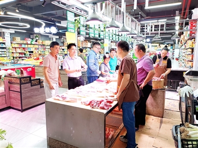 执法人员先后到镇农贸市场、商场超市、肉食经营店、饭店(农家乐)等重点经营场所对生鲜、冰冻肉类进行检查,详细了解经营方的原材料采购、物流运输、食品配送、超保质期食品处置等流程,了解其经营情况,严格要求肉类销售做到货票一致、来源可查、去向可追,全面整治无证无章、证章不全、货证不符、来历不明的肉品上市销售,并向肉类经营主体宣讲《食品安全法》《生猪屠宰管理条例》等法律法规,督促指导经营者严格落实食品安全两个责任,指导按照规范储存食品,严控肉类产品质量安全关。