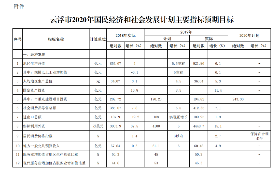 附件:云浮市2020年国民经济和社会发展计划主要指标预期目标