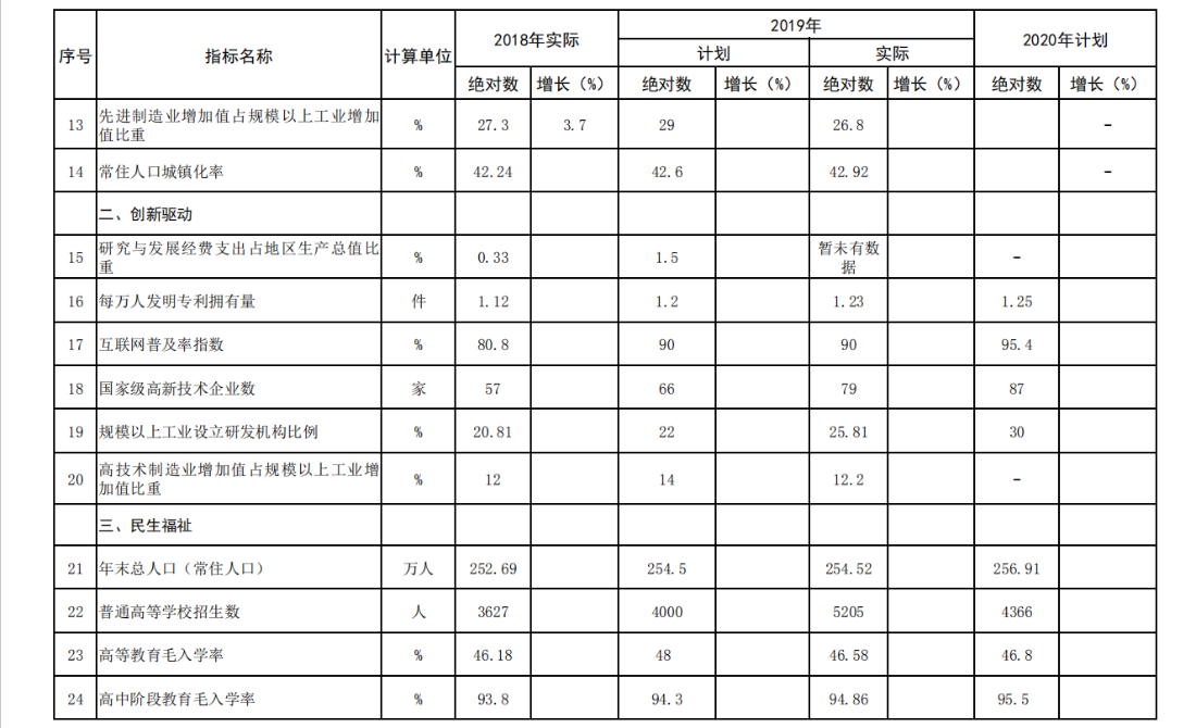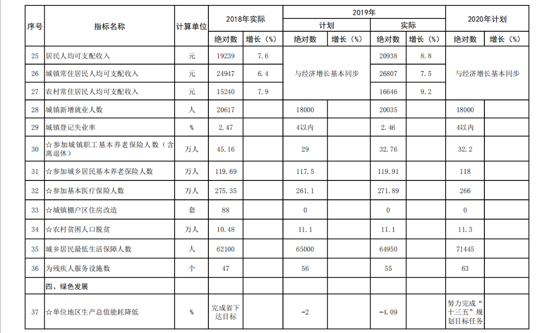 本着尊重经济规律和实事求是的原则,综合考虑当前我市实际,提出2020年我市经济社会发展主要预期目标如下:优先稳就业保民生,坚决打赢脱贫攻坚战,努力实现全面建成小康社会目标任务;年度城镇新增就业1.8万人,城镇登记失业率控制在4%以内;居民消费价格涨幅保持在合理水平;居民收入增长与经济增长基本同步;单位地区生产总值能耗和主要污染物排放量继续下降,努力完成“十三五”规划目标任务。