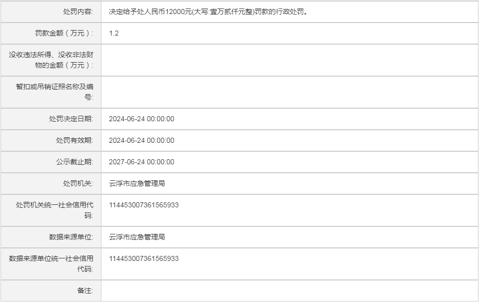 (云)应急罚〔2024〕33号中电建(云浮)绿色矿业有限信誉手机赌场下注最新官方行政处罚案