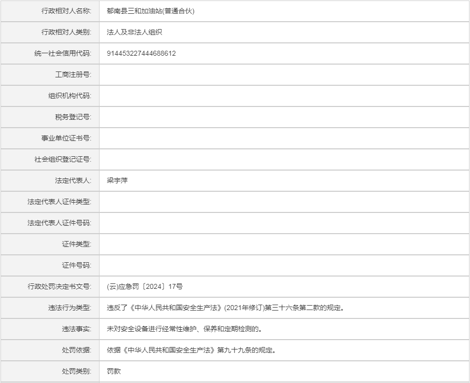 (云)应急罚〔2024〕17号郁南县三和加油站(普通合伙)行政处罚案