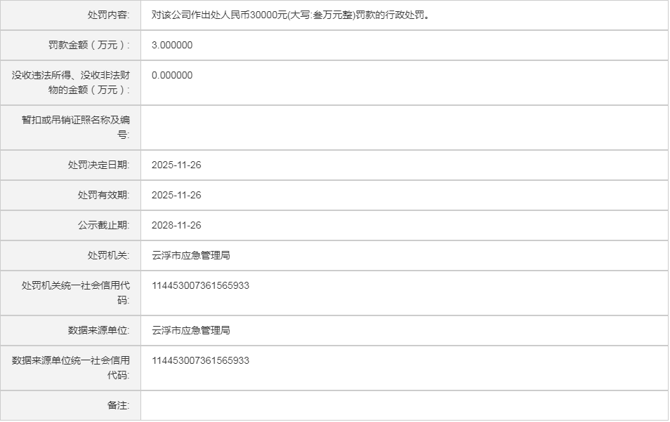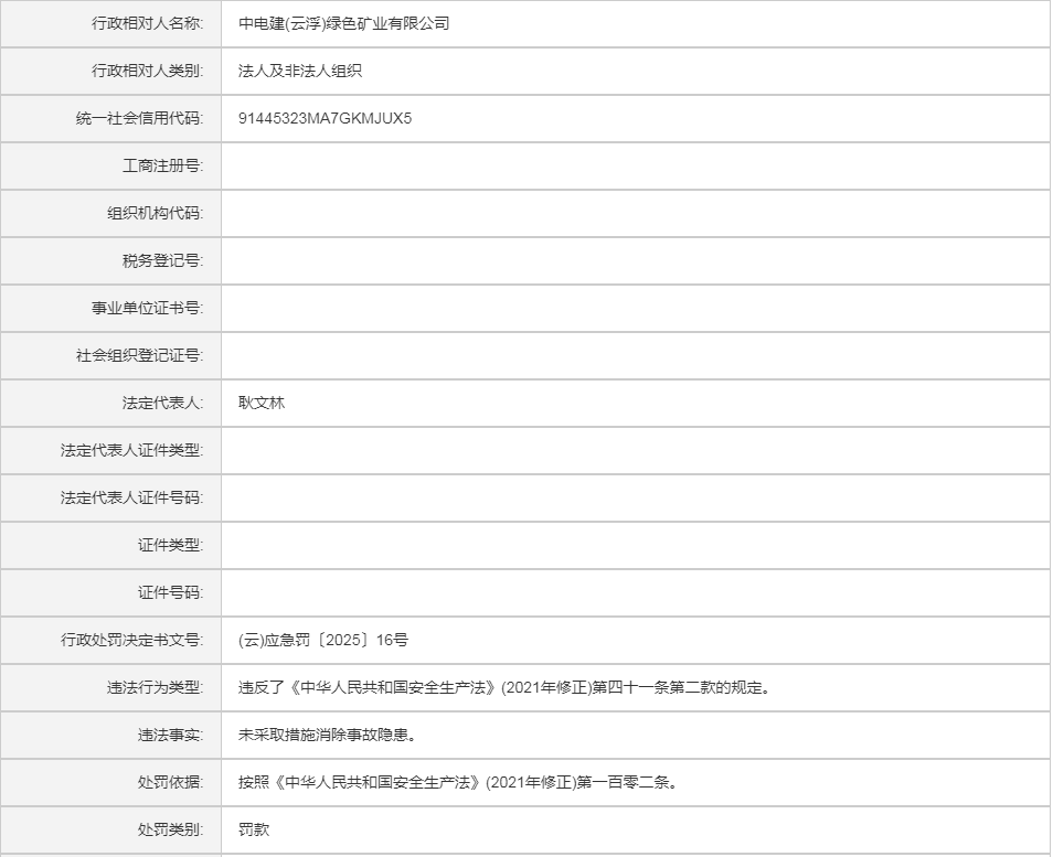 (云)应急罚〔2025〕16号中电建(云浮)绿色矿业有限十大老品牌网赌新版官网