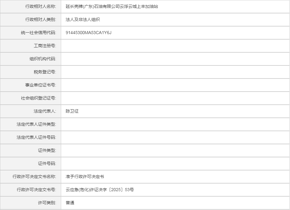 云应急(危化)许证决字〔2025〕53号延长壳牌(广东)石油有限十大正规赌网新版官网云浮云城上丰加油站危险化学品经营许可证(延期换证)