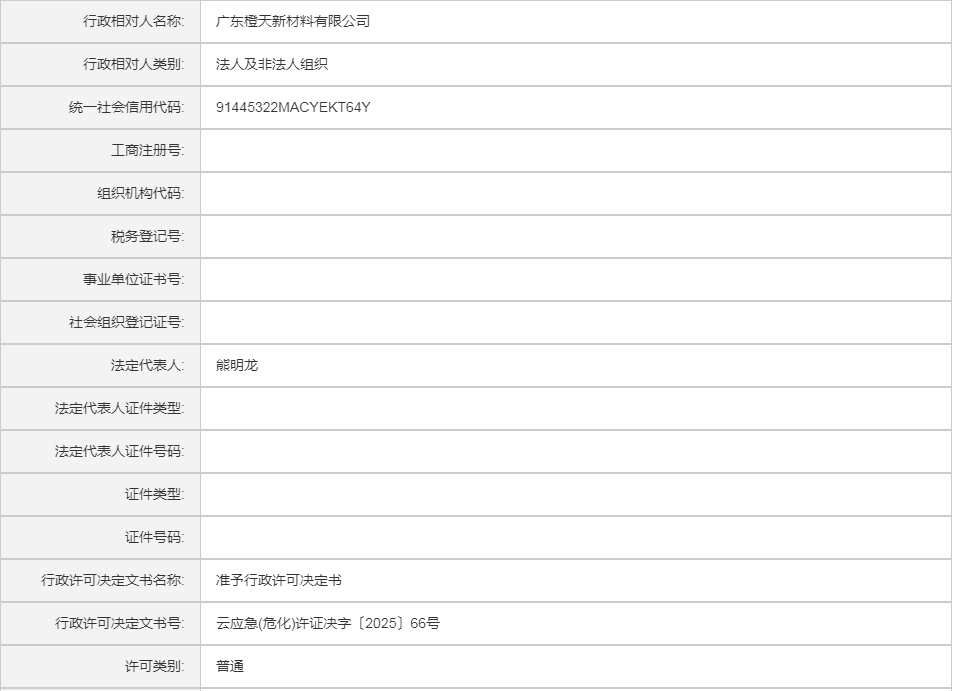 云应急(危化)许证决字〔2025〕66号广东橙天新材料有限十大网赌网址网址靠谱危险化学品建设项目安全条件审查意见书