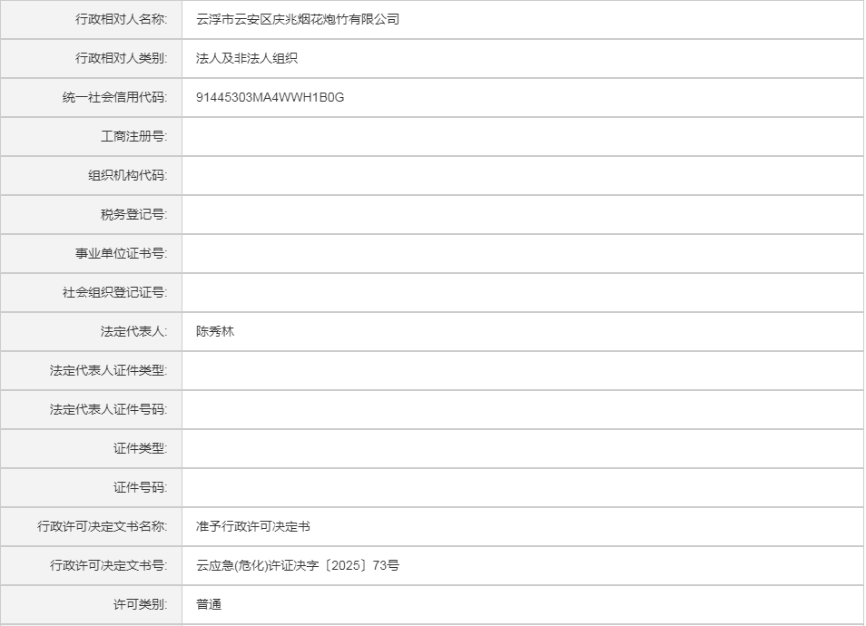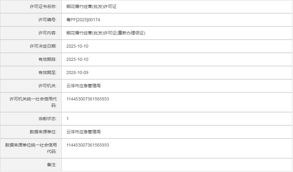 云应急(危化)许证决字〔2025〕73号云浮市云安区庆兆烟花炮竹有限十大网赌排行榜信誉网址烟花爆竹经营(批发)许可证(重新办理领证)