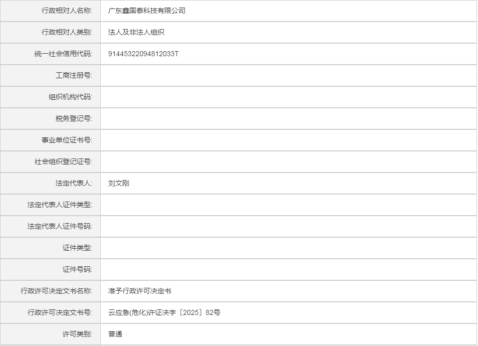 云应急(危化)许证决字〔2025〕82号广东鑫国泰科技有限全球十大赌钱软件排行应用危险化学品安全生产许可证(变更换证)