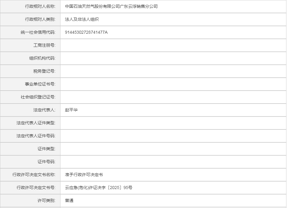 云应急(危化)许证决字〔2025〕95号中国石油天然气股份有限十大赌搏正规新版广东云浮销售分十大赌搏正规新版危险化学品经营许可证(变更换证)